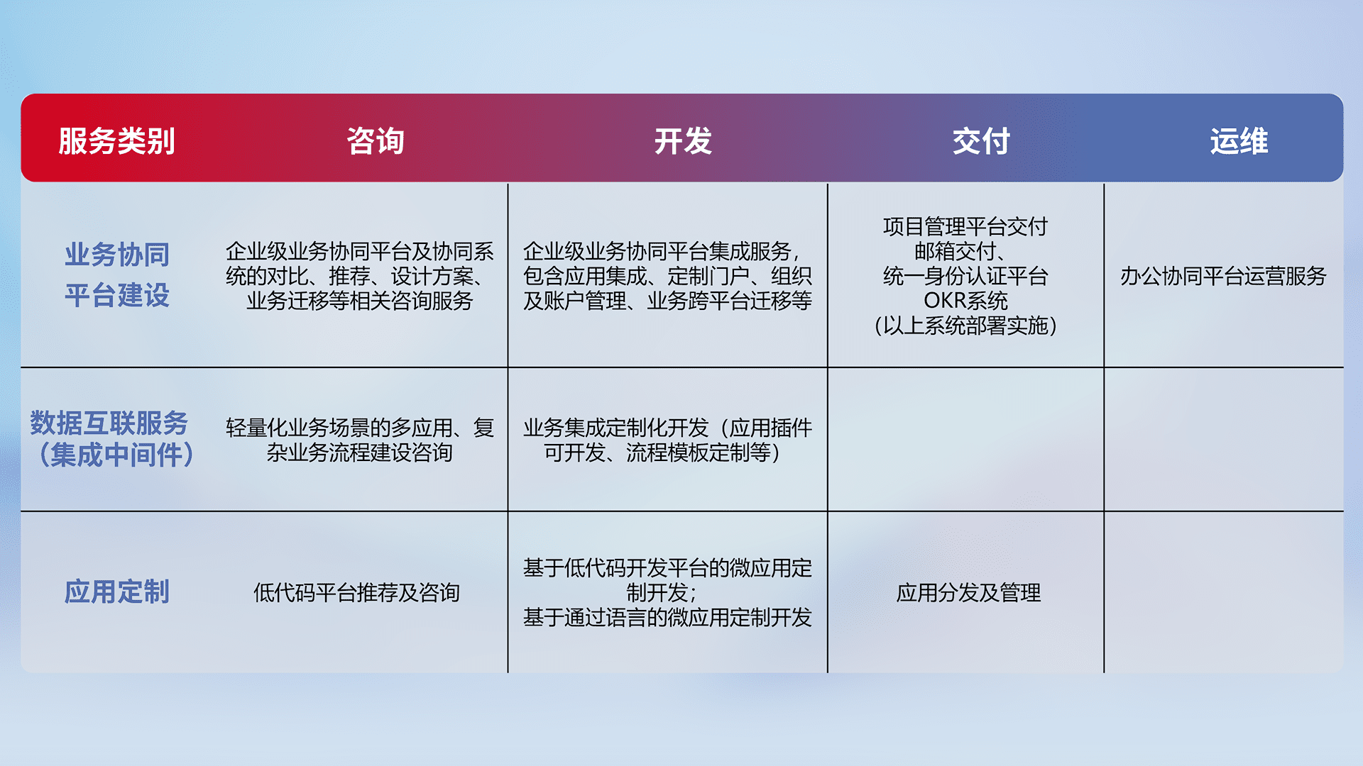 针对钉钉、、、企微、、IDaas等平台级产品提供产品的规划、、、、方案、、、交付、、定制化开发等服务,,实现如统一协同办公、、、、智能客户服务、、、、混合会议管理、、、智能数据查询、、、、等业务场景,,,,实现数字化转型。。。。